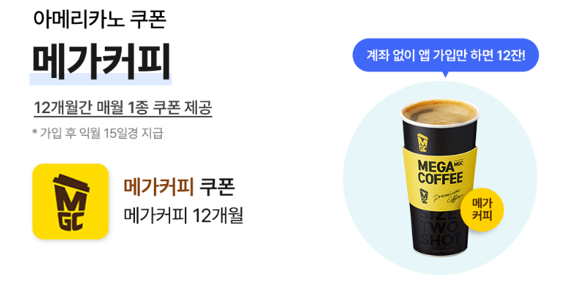 가입후 12개월간 매월 메가커피 아메리카노 쿠폰을 받을 수 있습니다. 무엇보다 눈여겨볼 점은 신한은행 계좌가 없더라도 신한 쏠 앱에 가입하면 12잔의 커피를 받을 수 있다는 점입니다. 신한은행 계좌를 꼭 만들어야 하는 부담 없이 혜택을 챙길 수 있습니다.