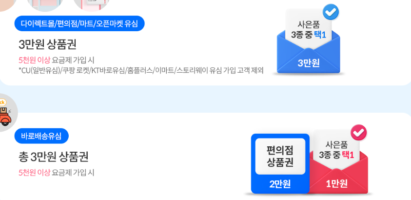 3만원 추가 혜택 상품권의 경우 어디서든 유심 구매 후 개통하면 기본으로 받을 수 있습니다. 이때 유심 구매처에 따라 조금 따른 혜택이 주어지는데요, 다이렉트몰/ 편의점/ 마트/ 오픈마켓에서 유심을 구입하고 5천 원 이상 요금제 가입 시 3만 원 상품권을 받을 수 있고, 바로 배송 유심일 경우 편의점 상품권 2만 원과 사은품 3종 중 하나를 선택할 수 있습니다.