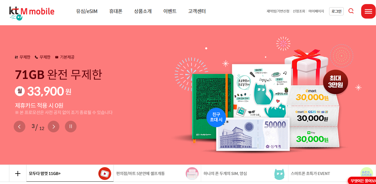 알뜰폰 요금제 선택시 kt M모바일을 선호하는 이유도 명확합니다. 수많은 알뜰폰 기업 중 국민기업 KT의 자회사로 신뢰도가 높고, KT통신망을 그대로 사용하기 때문에 데이터나 통화 품질은 그대로이지만 통신비는 반값이상 저렴한 비용으로 사용할 수 있다는 점입니다. 여기에 선택가능한 알뜰폰 요금제 폭이 넓은 점도 특징입니다.