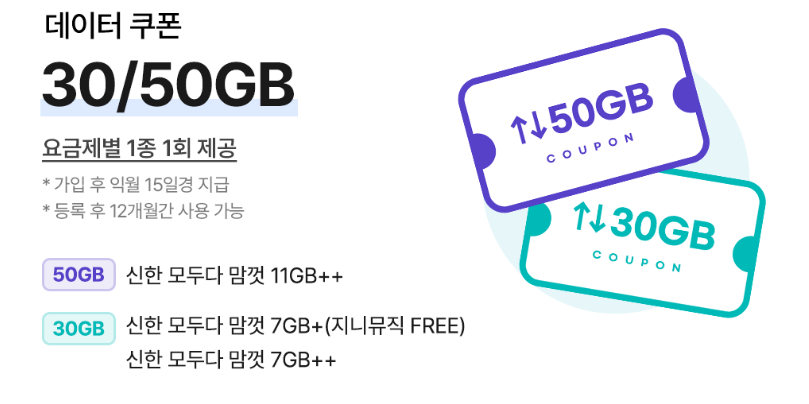 신한 SOL 요금제에 가입하면 요금제별 1종의 데이터 쿠폰을 제공받을 수 있습니다. 신한 모두 다 맘껏 11GB++ 요금제는 50GB 데이터 쿠폰이 주어지고, 신한 모두다 맘껏 7GB+(지니뮤직 FREE)와 신한 모두다 맘껏 7GB++ 요금제는 30GB 데이터 쿠폰이 주어집니다.