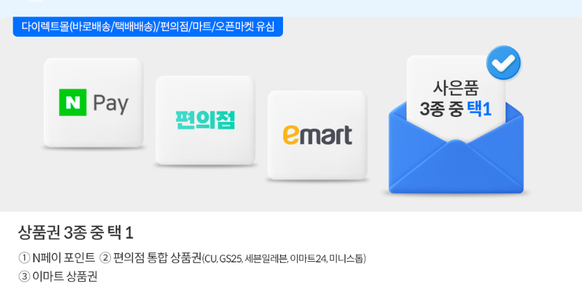 3만원 추가 혜택 상품권의 경우 어디서든 유심 구매 후 개통하면 기본으로 받을 수 있습니다. 이때 유심 구매처에 따라 조금 따른 혜택이 주어지는데요, 다이렉트몰/ 편의점/ 마트/ 오픈마켓에서 유심을 구입하고 5천 원 이상 요금제 가입 시 3만 원 상품권을 받을 수 있고, 바로 배송 유심일 경우 편의점 상품권 2만 원과 사은품 3종 중 하나를 선택할 수 있습니다.