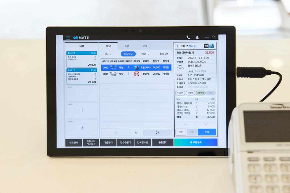 매출 정산에 있어서도 매장 내에서 발생한 매출과 함께 배달앱을 통해 발생한 매출까지 함께 확인하고 마감 정산이 가능해 매장매출과 배달매출을 각기 따로 계산하고 합산하는 번거로움 없이 메이트 포스에서 클릭 몇번 만으로 손쉽게 매출을 정산할 수 있습니다.