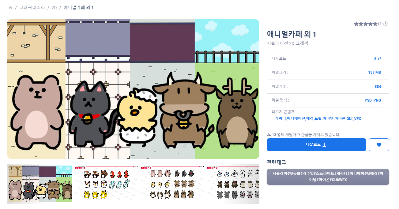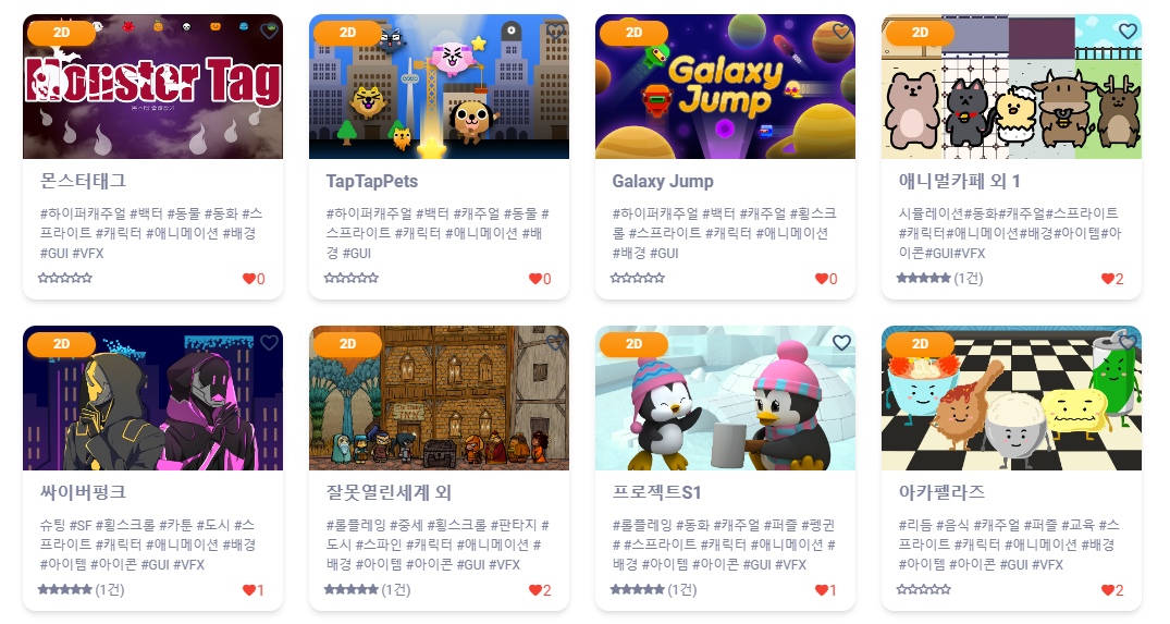 2D에 준비된 다양한 게임리소스 중 캐릭터 파트를 클릭해 보았는데요, 수 많은 게임의 각기 다른 특징을 가진 리소스들이 즐비하게 준비되어 있어 놀랐습니다. 무엇보다 일일이 클릭을 않아도 간단히 해당 리소스에 대한 정보를 확인할 수 있고, 평점이나 좋아요를 누른 인원들을 확인할 수 있어 선택 시 참고할 수 있었습니다.