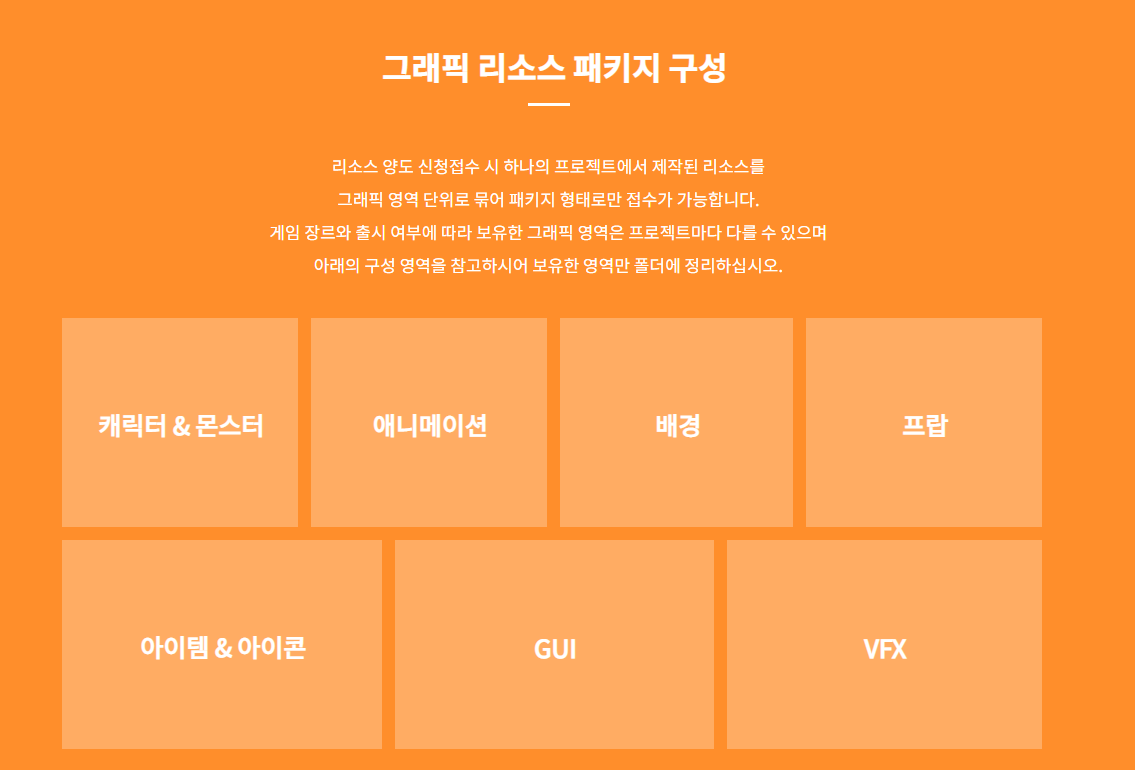 그래픽 리소스 패키지 구성에 있어서도 하나의 프로젝트에서 제작된 리소스를 포함해 그래픽 영역 단위로 묶어 패키지 형태로 구성되거나, 캐릭터나 몬스터, 애니메이션, 배경등 필요한 영역만 선택하여 해당 리소스를 무료로 다운로드할 수도 있습니다.