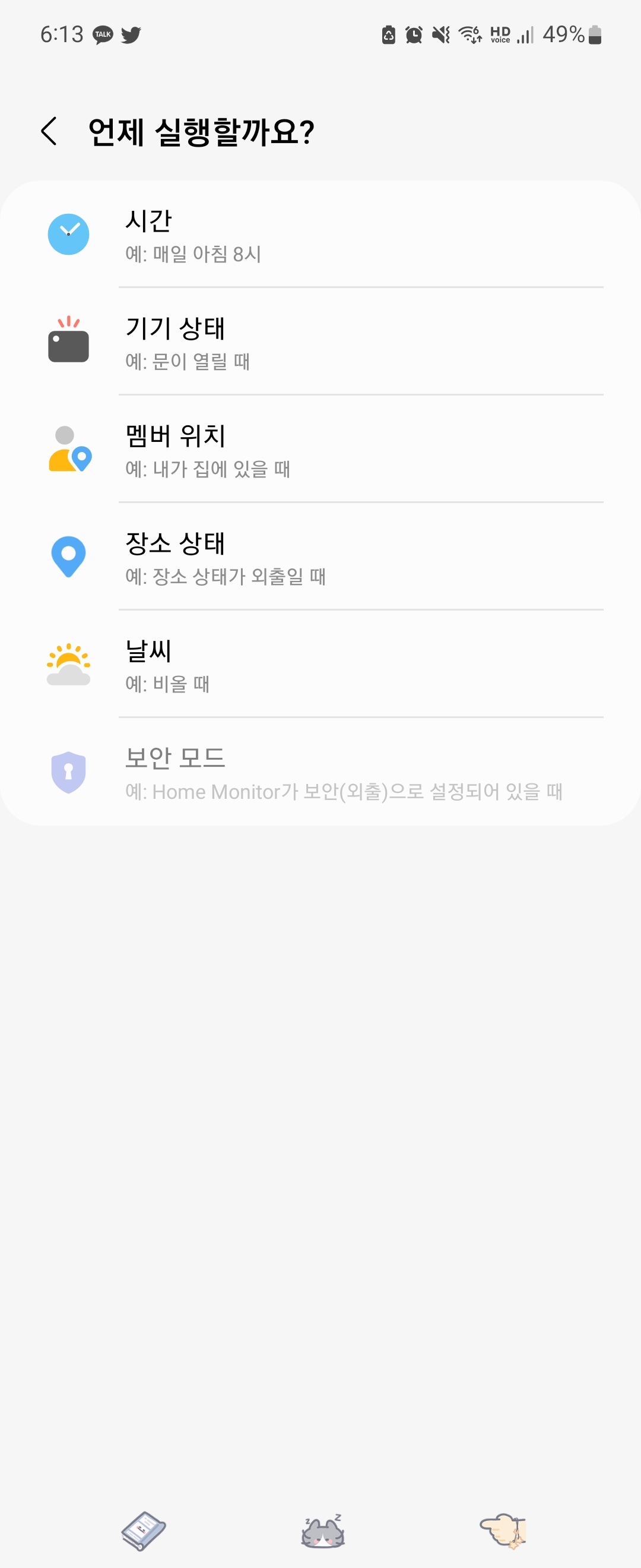 기기 등록이 완료되었다면 기기 이름을 설정하고 원하는 루틴을 추가할 수 있습니다. 루틴은 시간/ 기기상태/ 멤버 위치/ 장소 상태/ 날씨 설정을 통해 원하는 상황을 선택하고 해당 설정에 따라 자동으로 실행되기 때문에 매번 설정하고 관리해야 하는 번거로움이 없어 편리합니다.