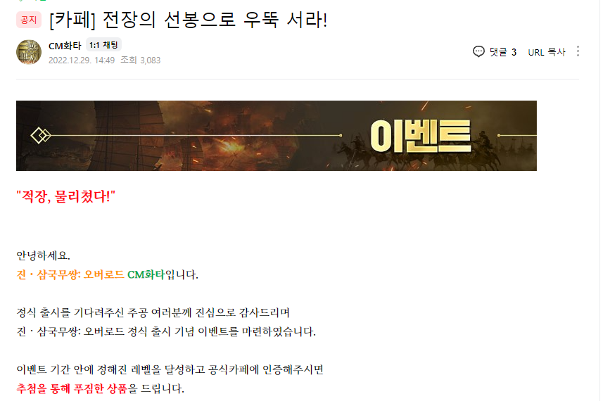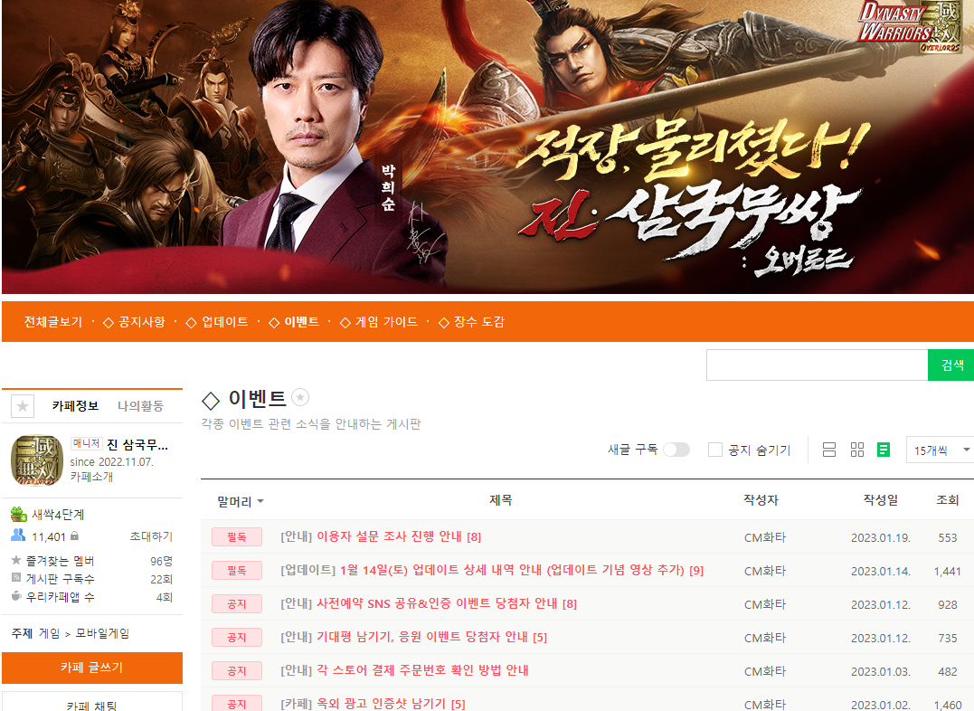 공식카페에서 진행되는 이벤트는 주공 레벨 달성 외에도 옥외 광고 인증샷 남기기, 버그를 물리쳤다 이벤트 등 각종 보상을 수령할 수 있는 다양한 이벤트가 진행 중입니다. 진삼국무쌍 오버로드의 호쾌한 전투도 즐기고 이벤트에도 참여해 풍성한 선물도 받아보시기 바랍니다.