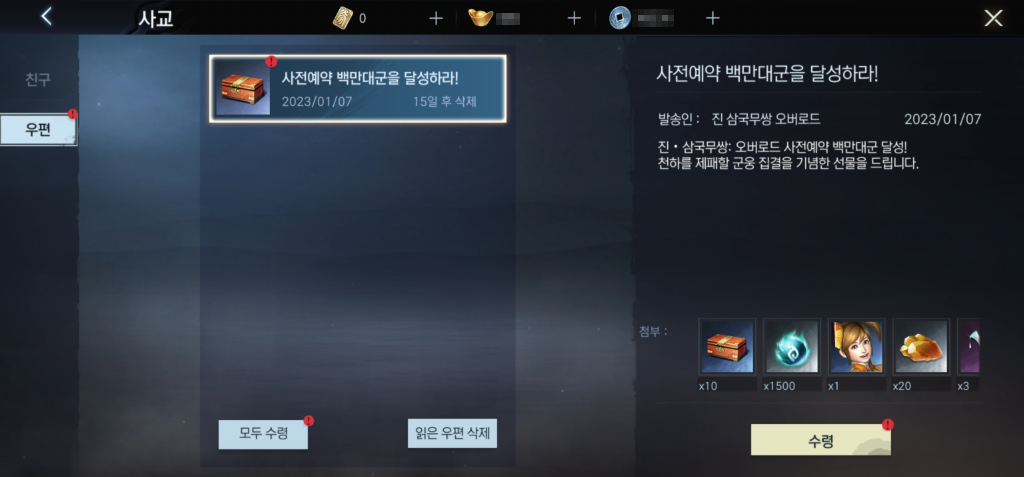 사전예약 보상으로 주어지는 아이템만 수령해도 스토리를 따라 진행되는 국전을 보다 수월하게 클리어할 수 있어 꼭 챙기는 걸 추천드립니다.