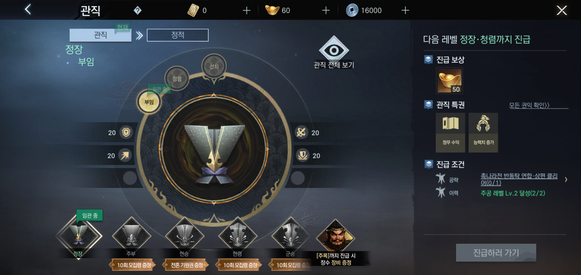 스토리를 따라 진행되는 스테이지 전투 외에도 성 안에서 활동이라던가 관직 진급을 바탕으로 능력치를 올릴 수 있습니다. 일정레벨에 도달하면 다른 플레이어와 PVP도 즐길 수 있는데요, 플레이를 즐기면 즐길수록 진삼국무쌍 오버로드가 가지고 있는 재미에 푹 빠져드는 것 같습니다.