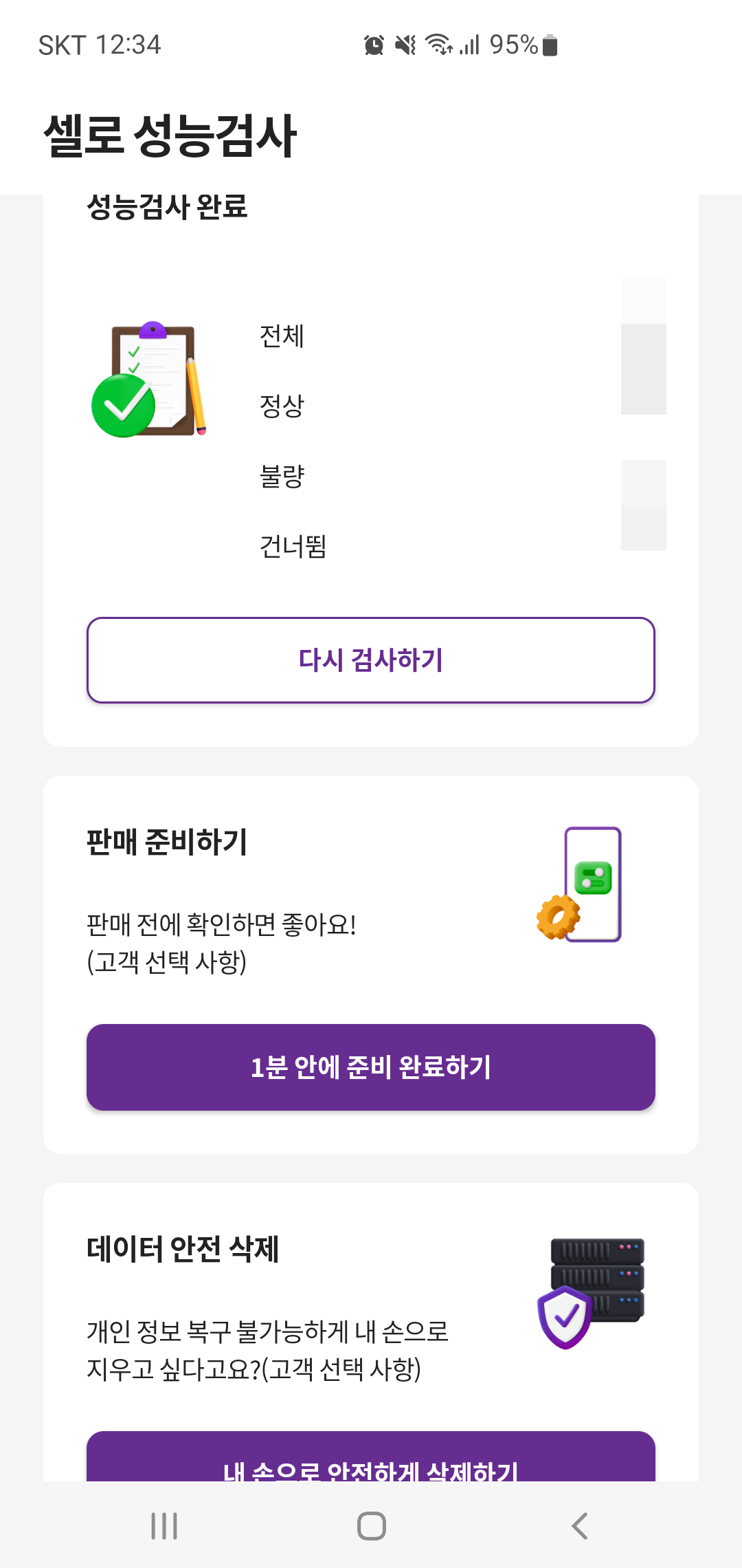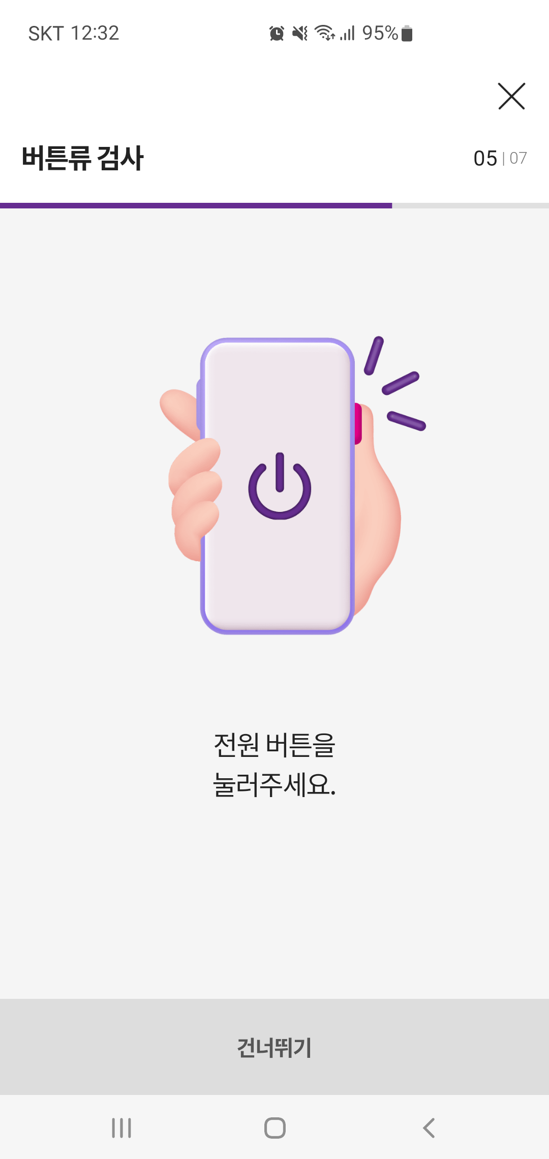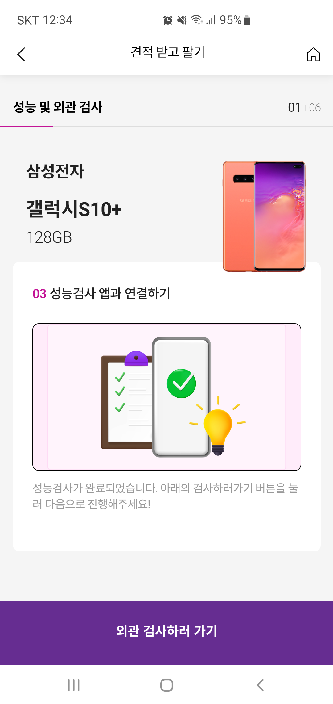 셀로 성능검사가 완료되면 성능검사 앱과 셀로 앱이 연동되어 이후 외관검사를 진행하게 됩니다. 성능검사의 경우 상황에 따라 바로 진행할 수 없는 부분들은 건너뜀이 가능하니 부담 없이 진행해도 됩니다.