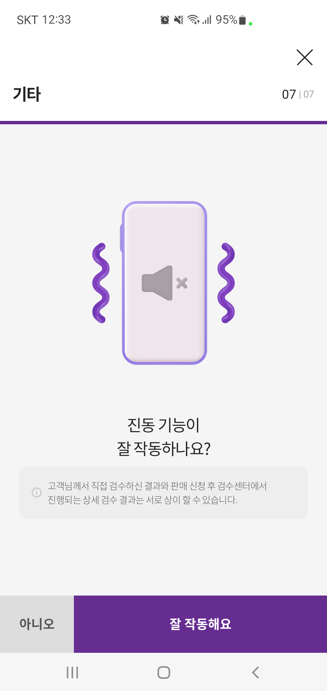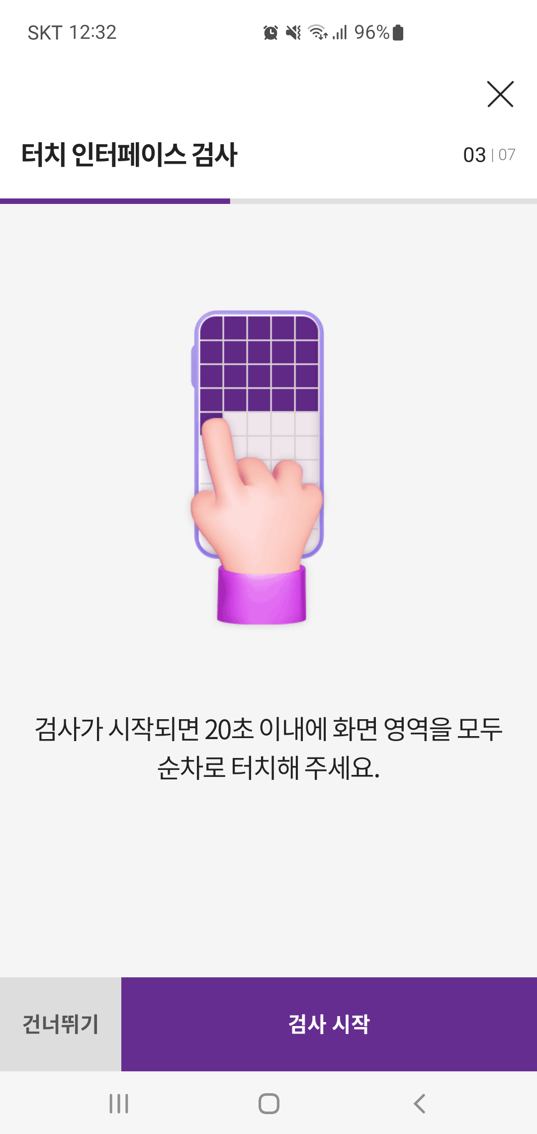 셀로 성능검사 앱을 설치하면 총 7단계로 내폰 상태를 확인할 수 있습니다. 진동기능부터 마이터, 전원 그리고 터치 인터페이스 등 스마트폰이 가지고 있는 기능에 대한 전반적인 검사를 확인하게 됩니다.