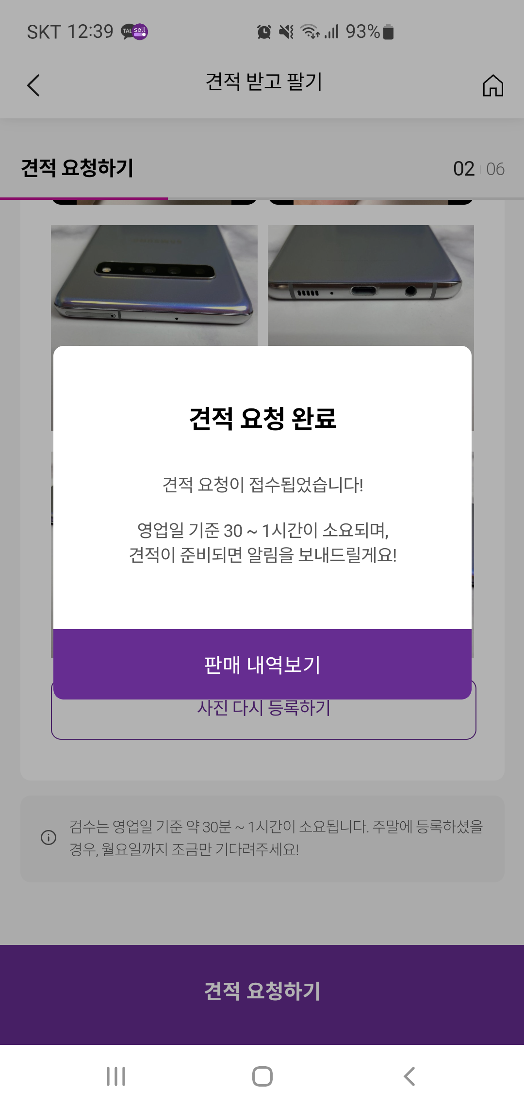 성능검사 결과를 연동한 후 전면과 후면 그리고 양쪽 측면과 상하측면 외관사진까지 총 6장의 사진을 등록한 후 견적요청하기 버튼을 누르면 영업일 기준 30~1시간 기준으로 견적을 받을 수 있습니다.