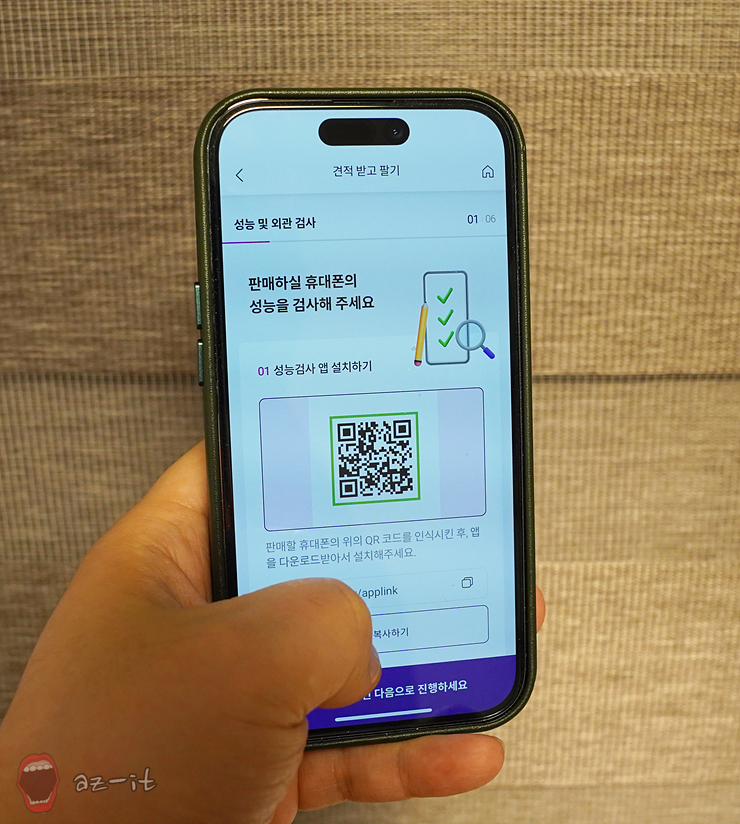 내 폰 팔기의 경우 검수에 따라 비용 차이가 날 수 있어 보다 정확도가 높은 비용을 확인하려면 견적 받고 팔기를 선택하면 손쉽게 확인할 수 있습니다. 메인화면에서 견적 받고 팔기를 선택해 판매할 중고폰에 성능검사 앱을 설치하고 성능검사를 진행합니다.