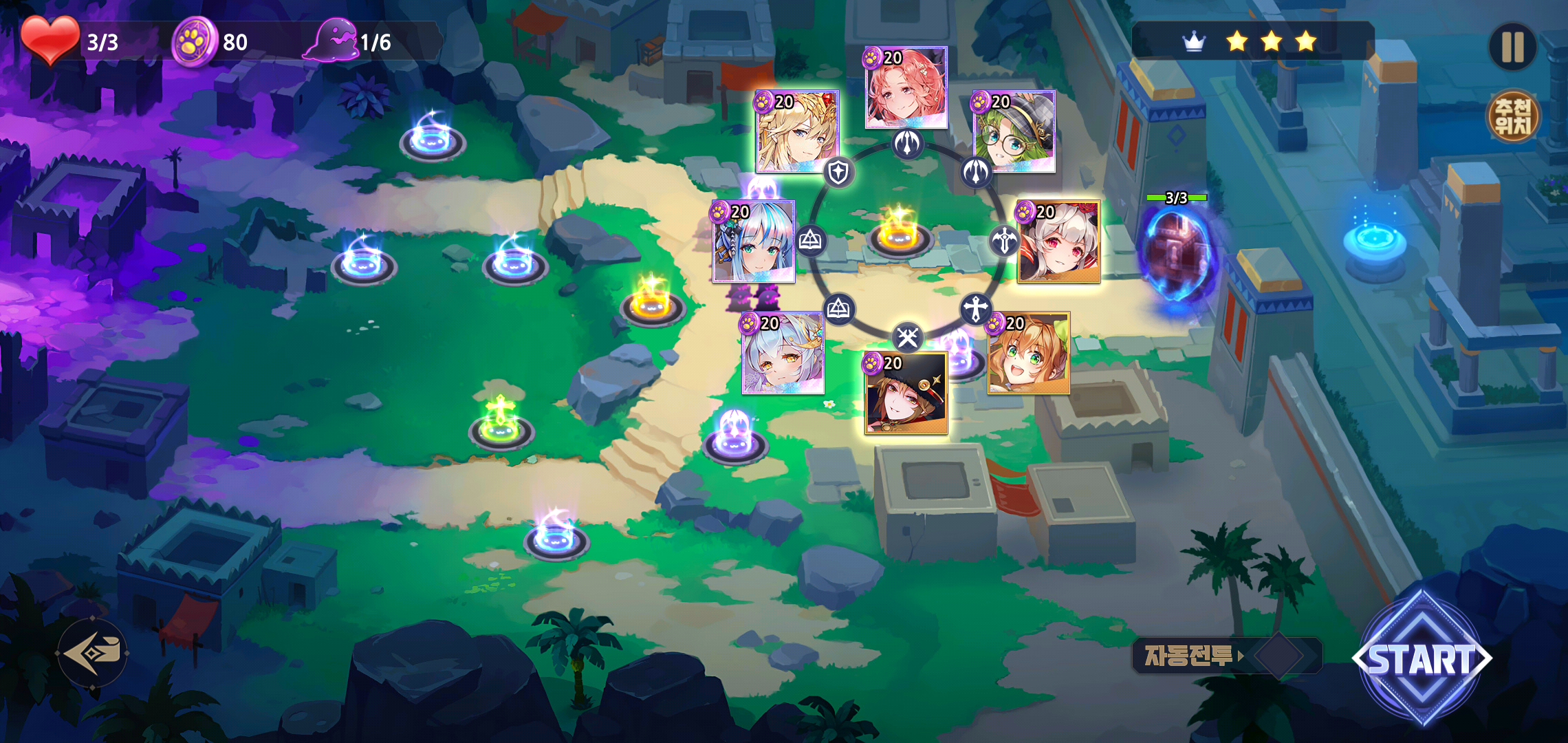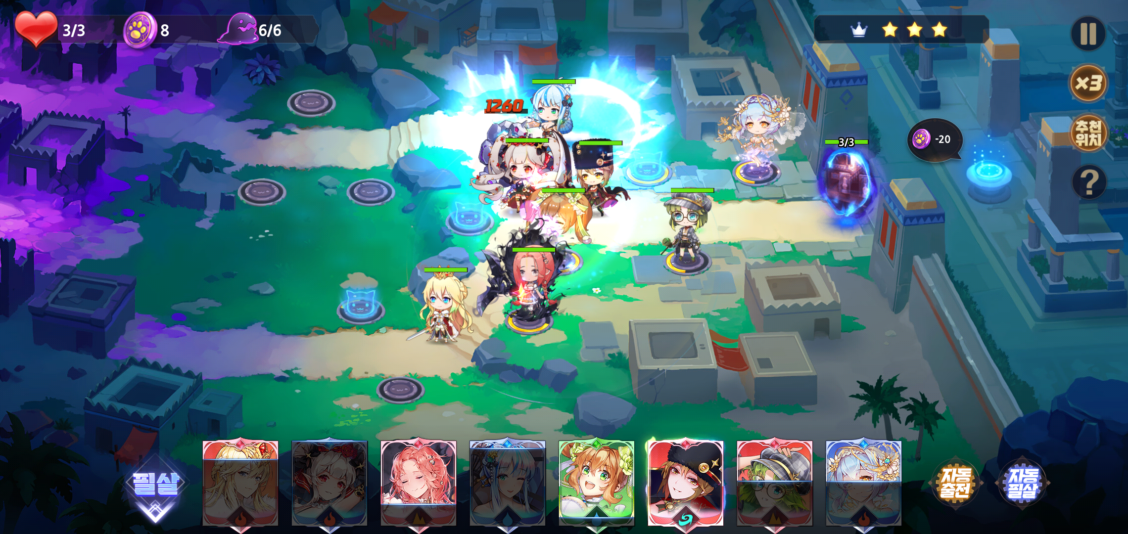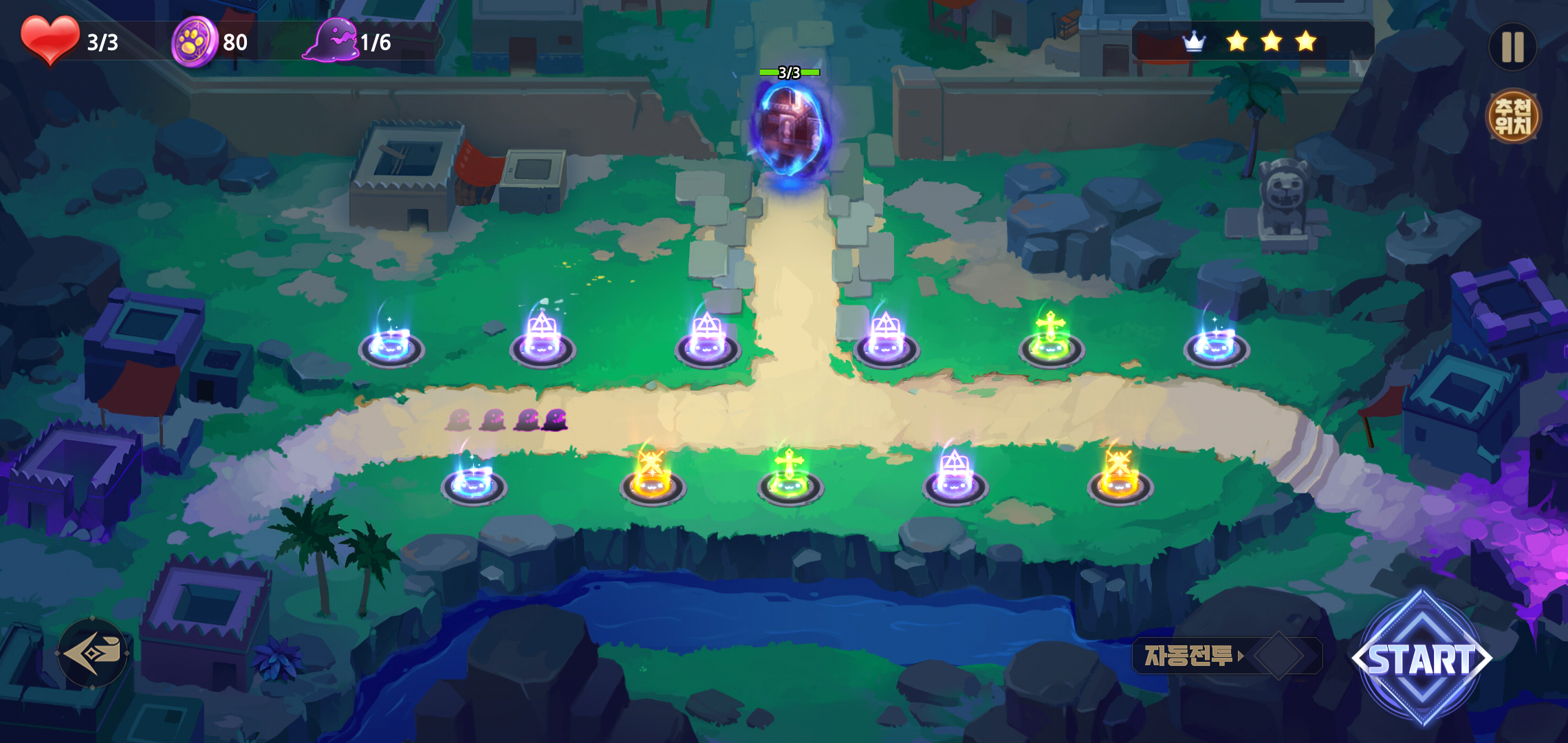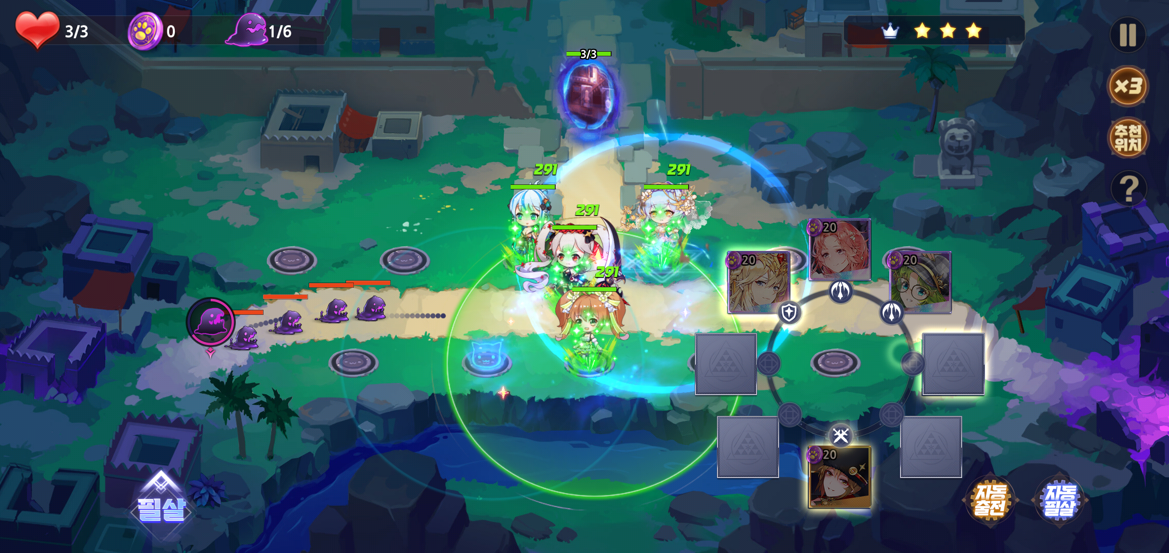 본격적인 전투가 시작되기에 앞서 적이 등장하는 길목에 미리 덱으로 구성한 소울을 배치하게 됩니다. 이때 일일이 배치하고 필살기 사용이 번거롭다면 자동전투를 클릭해 실시간 배치와 필살기를 활용할 수 있어 플레이를 즐기는데 불편한 부분은 찾기 힘들 정도입니다.