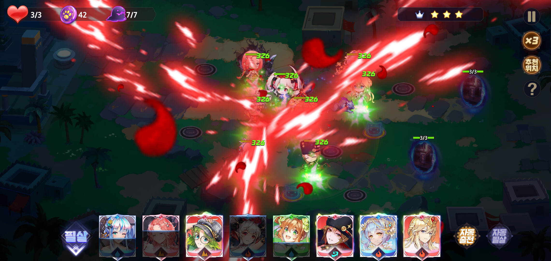 본격적인 전투가 시작되기에 앞서 적이 등장하는 길목에 미리 덱으로 구성한 소울을 배치하게 됩니다. 이때 일일이 배치하고 필살기 사용이 번거롭다면 자동전투를 클릭해 실시간 배치와 필살기를 활용할 수 있어 플레이를 즐기는데 불편한 부분은 찾기 힘들 정도입니다.