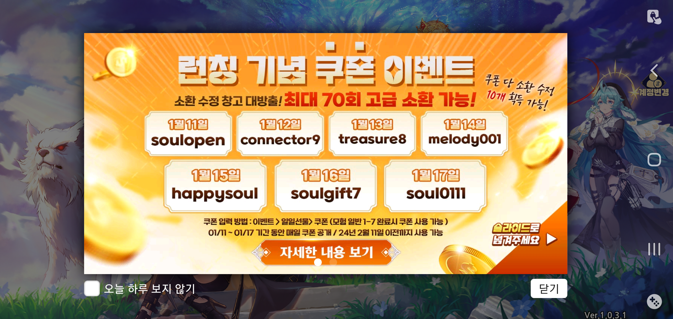 출석만 해도 주어지는 풍성한 아이템을 시작해 초보자 이벤트, 특별 이벤트까지 플레이만 즐겨도 획득가능한 보상이 상당해 부족함 없는 초반 플레이를 즐길 수 있습니다. 여기에 공식카페를 통해 제공되는 쿠폰을 이용하면 최대 70회 고급 소환이 가능해 SS등급 소울 획득은 기본으로 챙기고 갈 수 있으니 할만한게임을 고민 중이라면 지금 소울 커넥터에 접속해 보시기 바랍니다!