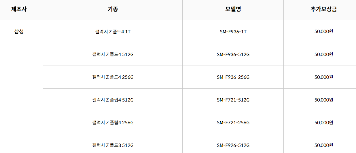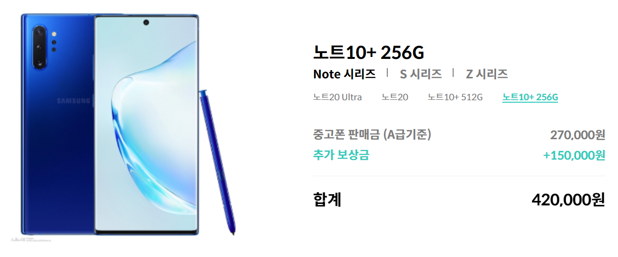 주요 모델에 대한 예시 금액이 정리된 내용을 보면 보다 명확하게 차이를 구분할 수 있습니다. 노트 10+ A급기준으로 256G와 512G 중고폰 판매금이 다른 점을 확인할 수 있는데요, 여기에 추가 보상금까지 더해지니 노트10+ A급 기준 42만원이라는 보상금을 받을 수 있습니다. 다른 중고폰 판매 금액을 확인해도 이 정도 비용은 어림없을 것 같아요.