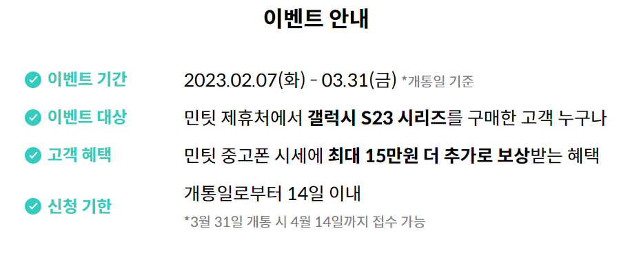 민팃 추가보상 이벤트는 3월 31일까지 진행되며 민팃 제휴처에서 갤럭시 S23 시리즈를 구매한 고객이라면 누구나 가능합니다. 무엇보다 이번 추가보상혜택은 민팃 중고폰 시세에 최대 15만원을 더 추가보 보상받을 수 있기 때문에 다른 중고폰 판매처와는 비교도 안될 정도입니다.