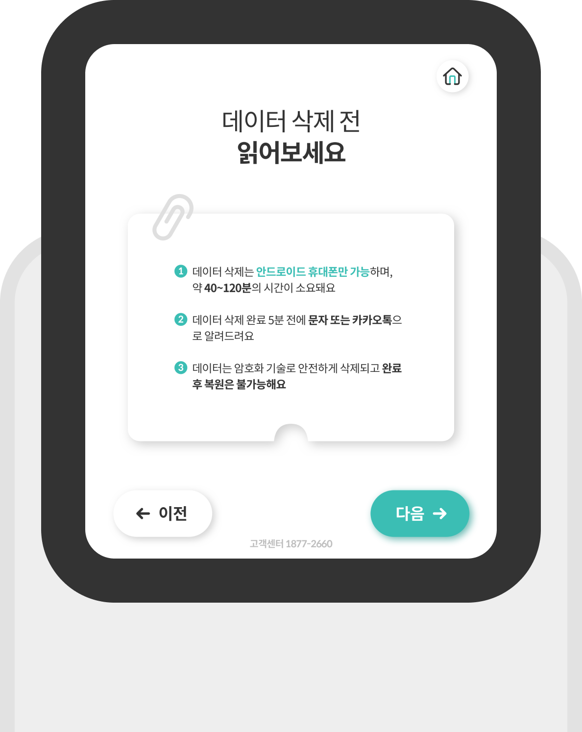 민팃은 국제품질인증기관 국제품질인증기관인(TUV SUD)에서 국내 최초로 안드로이드폰의 개인정보 및 데이터 삭제를 수행하는 삭제 프로그램(앱)에 대한 국제 표준 인증(SQA)을 획득하여 적용하고 있는 만큼 중고폰판매 시 가장 신경 쓰이는 데이터 삭제 부분도 안심할 수 있습니다.
