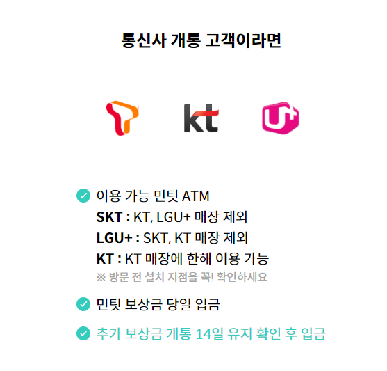 민팃 중고폰 판매 시 구입처 별로 반납처가 조금씩 다른 점도 유념해야 합니다. 통신사 개통을 진행했다면 각 통신사 매장에 설치된 민팃ATM을 통해 반납가능하며, 민팃 보상금은 당일 입금됩니다. 단, 추가 보상금은 개통 14일 유지가 확인된 이후 입금이 진행됩니다. 자급제 구매 고객이라면 통신사 매장에 설치된 곳을 제외한 전국 민팃ATM에서 반납 가능하며, 민팃 보상금과 추가보상금을 당일 입금받을 수 있습니다.
