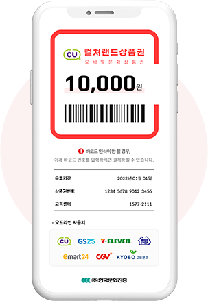GS25를 포함해 이마트24, 스페이스24, CU 그리고 세븐일레븐과 함께 하는 이벤트로, 편의점에서 컬쳐랜드 상품권 구매시 실시간 추첨을 통해 1매가 추가되는 이벤트입니다. 이때 1+1으로 수령 가능한 상품권이 구매한 상품권과 같은 금액으로 지급되는 만큼 컬쳐캐쉬상품권이 필요하다면 가까운 편의점에 방문해 1+1의 행운을 기대해보는 것도 좋을 것 같습니다.