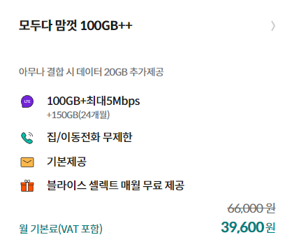 모두다 맘껏 100GB++ 요금제는 데이터 100GB + 5Mbps + 매월 150GB가 제공되어 매월250GB의 데이터를 마음껏 사용하고 통화와 문자를 무제한으로 이용할 수 있습니다. 고용량 데이터를 사용하는 분들에게 적합한 요금제로, 모바일게임이나 OTT서비스를 끊임없이 이용하고 싶다면 딱 맞는 요금제입니다. 무엇보다 일반 통신사에서 동일한 조건으로 가입할 수 있는 요금제와 비교하면 말도 안 될 정도로 저렴한 점이 특징입니다.
