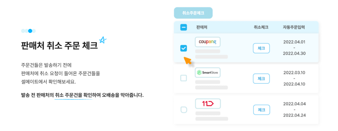 주문건주문 건 배송에 있어 마지막까지 챙겨야 하는 부분 바로 취소주문입니다. 판매처에 취소 요청이 들어온 건을 확인하지 않으면 오배송이 발생하기 때문인데요, 셀메이트는 발송 전 판매처 위소 주문 건을 한눈에 파악하고 처리할 수 있어 오배송을 막아주는 역할도 톡톡히 합니다.