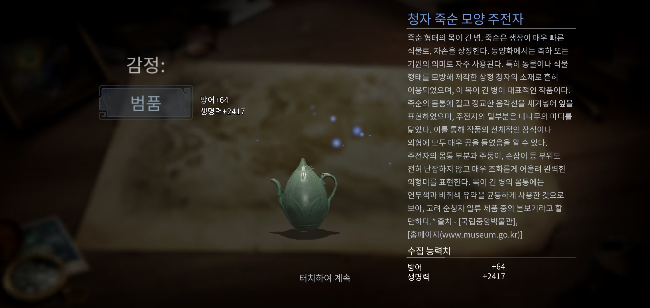 인던을 통해 획득한 유물은 감정을 통해 진가를 확인할 수 있습니다. 유물은 단순히 시대적 배경만을 가지고 있는 게 아니라 그 가치를 어떻게 평가받는지에 대한 내용도 함께 확인할 수 있는데요, 유물을 획득하고 성급 상승과 영혼주입을 통해 능력치를 올려 전투력 상승에 도움을 받을 수 있기도 합니다.