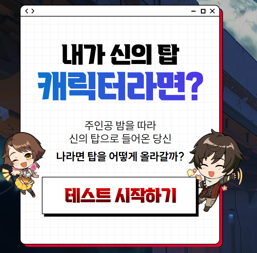 내가 신의탑 캐릭터라면 누구와 가장 닮아있는지에 대한 테스트도 준비되어 있어 가볍게 참여할 수 있습니다. 직접 탑에 오른다고 생각하고 질문에 대한 대답을 선택하는 방식으로 진행되는데요, 테스트 결과 사교적인 탐색꾼 십이수가 등장해 조금 놀랐습니다. 본인에게 가장 어울리는 캐릭터가 누구인지 궁금하다면 잊지 말고 테스트에 참여해 보세요!