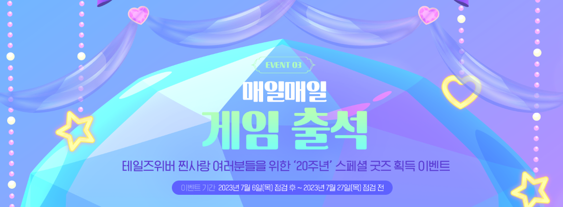 7월 27일 업데이트 전까지 게임에 매일 접속해 출석하면 테일즈위버 20주년 오르골을 선물로 받을 수도 있습니다. 매일 게임 출석과 함께 자동으로 추첨이 진행되는데요, 총 100개의 테일브위버 20주년 오르골이 준비되어 있고, 1일 1회 참여로 당첨여부를 바로 확인할 수 있습니다.