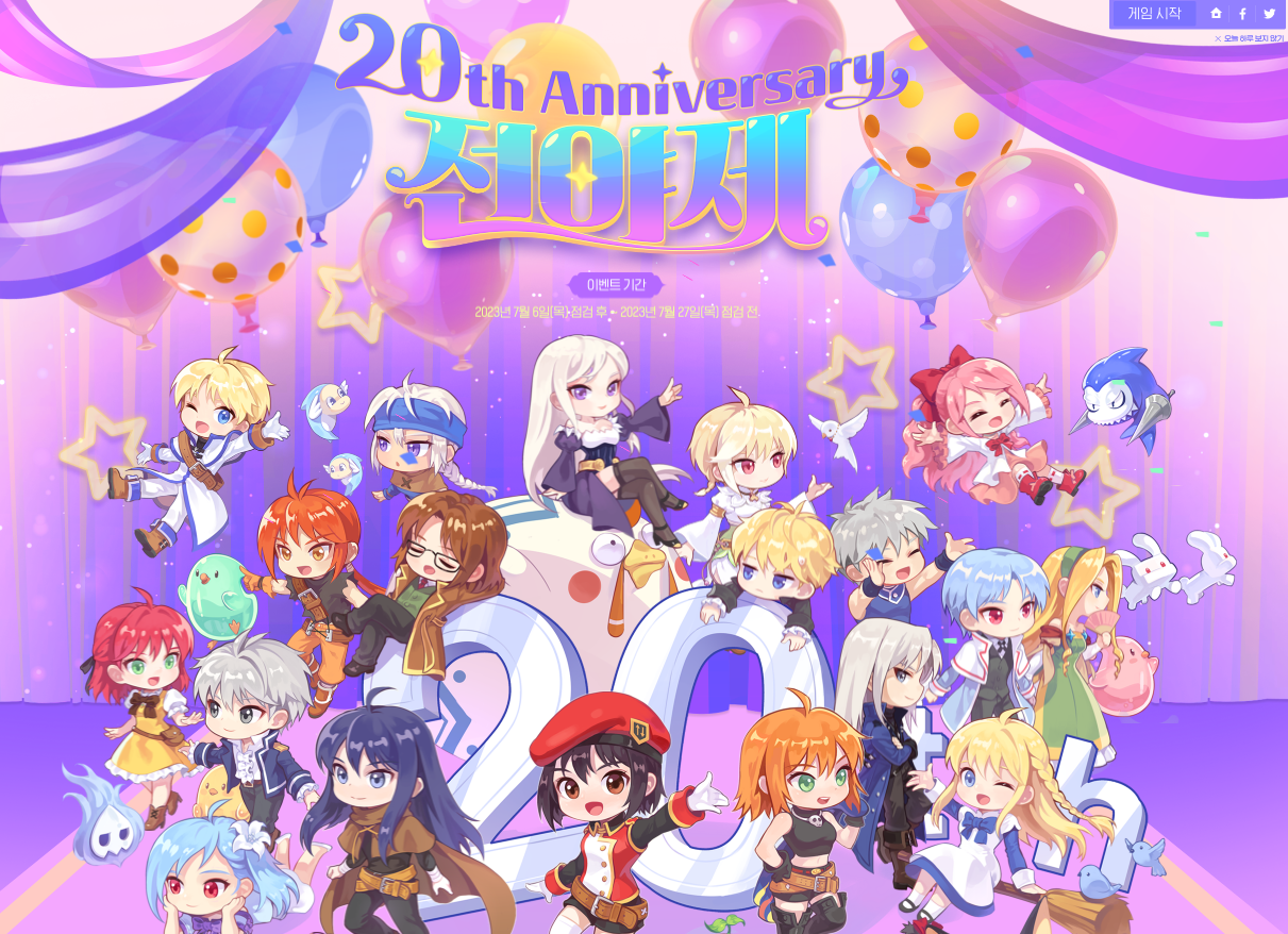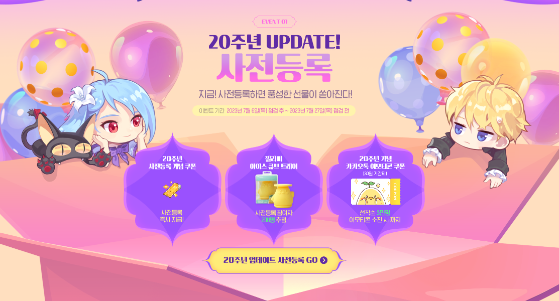 오는 7월 27일 20주년 업데이트를 앞두고 누구보다 소식을 빠르게 접하고 시작할 수 있는 사전등록이 한창 진행 중입니다.사전예약에 참여하면 20주년 사전등록 기념 쿠폰을 즉시 지급받을 수 있고, 추첨을 통해 200명에게는 젤리삐 아이스 큐브 트레이를 지급하고, 선착순 3만 명에게는 30일 기간제 아이템인 20주년 기념 카카오톡 이모티콘 쿠폰을 소진 시까지 지급합니다.
