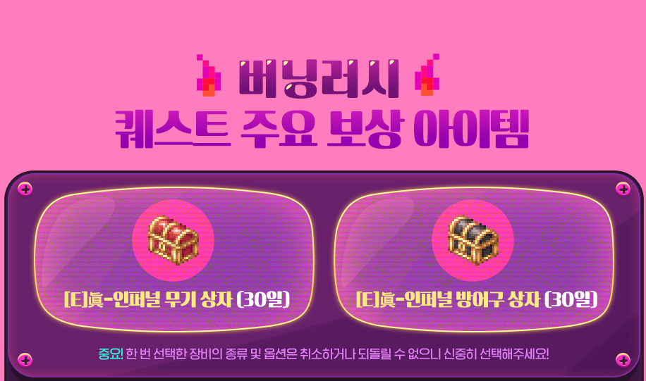 특히 버닝러시 퀘스트를 진행하면서 획득할 수 있는 주요 보상 중 眞-인퍼널 무기상자(30일)와 眞-인퍼널 방어구 상자가 포함되어 있어 초반 장비로 인한 스펙은 염려하지 않아도 될 정도입니다. 또한 캐릭터로 지정한 즉시 경험치 획득량 +500%와 이동속도 +10등 캐릭터 성장을 훨씬 빠르게 도와줄 버프까지 주어지기 때문에 버닝러시를 활용한 초스피드 캐릭터 육성도 노려볼 수 있습니다.