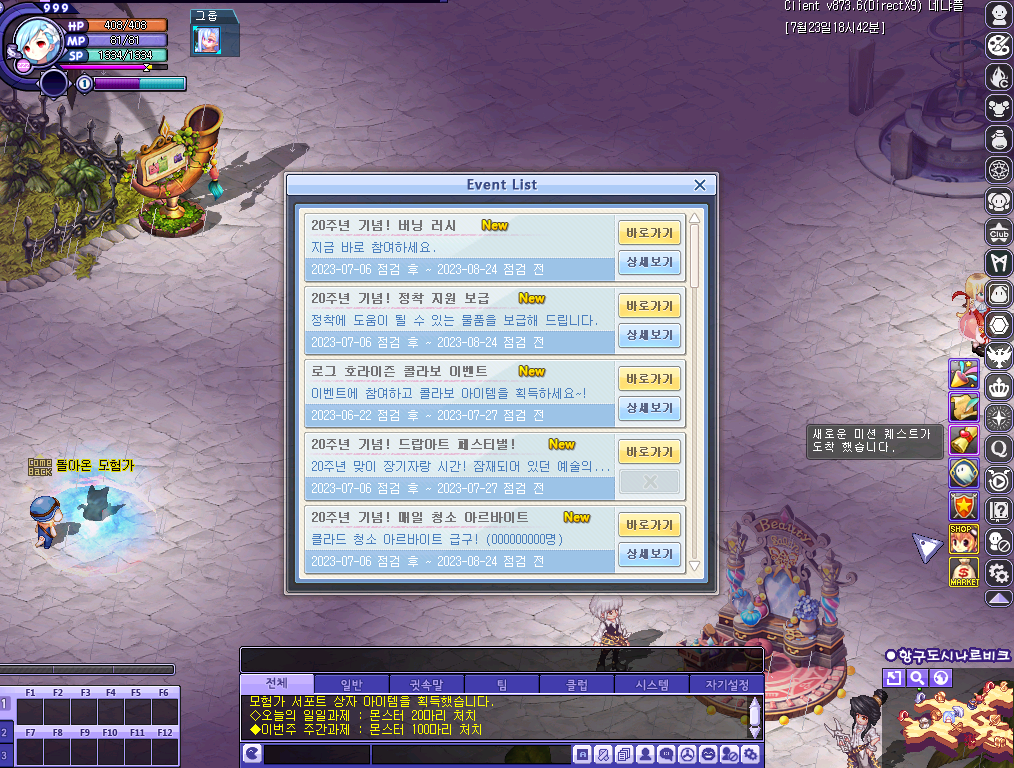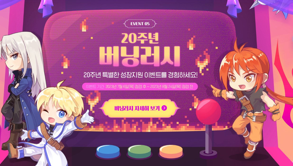20주년을 맞이해 특별한 성장지원 이벤트 버닝러시가 8월 24일까지 진행됩니다. 버팅러시는 20주년 기념 버닝러시와 20주년 기념 정착지원 보급 두 가지 방식으로 진행되며, 기존 유저를 포함 신입/복귀 유저라면 빠르고 쉽게 캐릭터를 키울 수 있는 절호의 찬스이기도 합니다.