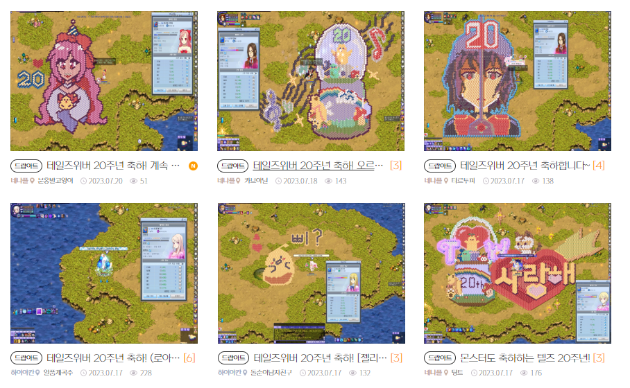 테일즈위버 20주년 맞이 장기자랑 드랍아트 페스티벌도 7월 27일까지 진행됩니다. 드랍아트에 참여한 인원중 아티스트상 5명에게는 테일즈위버 20주년 오르골이 선물로 주어지고 노력상 10명에게는 젤리베 아이스 큐브 트레이가 지급됩니다.