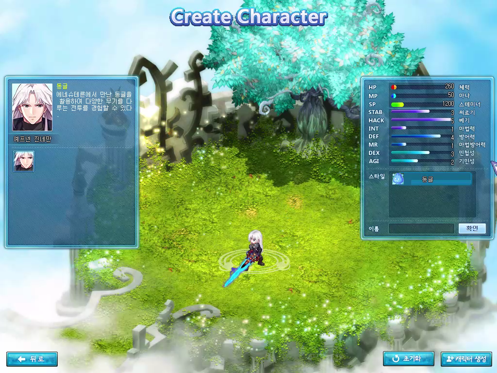 사전예약페이지 또는 테일즈위버에 접속하면 캐릭터 생성단계에서 예프넨 사전생성 버튼을 눌러 캐릭터 생성이 가능합니다. 캐릭터를 선택하면 예프넨 진네만에 대한 스탯을 확인하고 원하는 이름을 지정해 생성이 가능합니다.