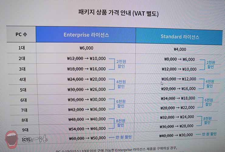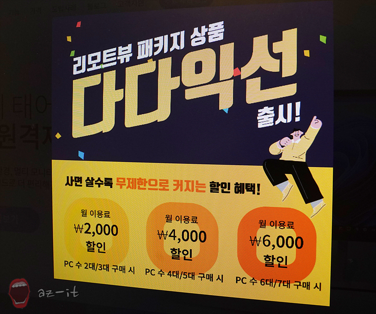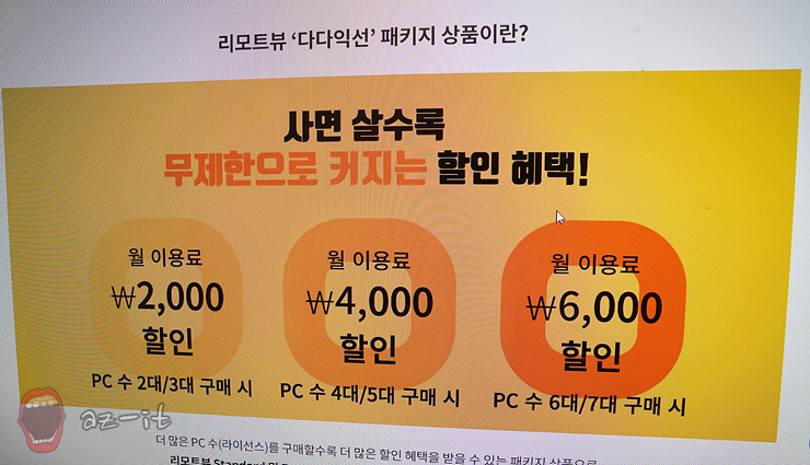 원격제어 리모트뷰를 보다 합리적으로 구매하고 이용해 보고 싶다면 현재 진행 중인 다다익선 패키지 상품을 활용해 보시길 추천드립니다. 다다익선 패키지는 더 많은 라이선스를 구매할수록 더 많은 혜택을 받을 수 있는데요, 리모트뷰 Standard 및 Enterprise 제품 2대 이상, 1개월 구매 시 월 2천 원, 4천 원, 6천 원, 8천 원으로 증가하는 이용료를 책정하고 있어 무제한으로 늘어나는 할인 혜택이 제공됩니다.