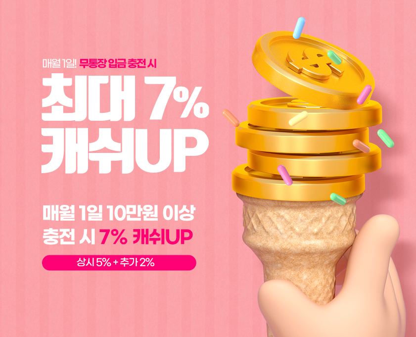 컬쳐랜드 홈페이지에서 진행되는 매월 1일 10만 원 이상 무통장 입금 충전 시 7% 캐쉬UP을 진행하는 이벤트를 활용하는 것도 방법입니다. 상시 5% 캐쉬UP을 해주는 혜택이 매월 1일에만 추가2% 캐쉬UP 혜택이 추가되어 총 7% 혜택을 받을 수 있어 전환수수료에 대한 부담을 확 낮출 수 있습니다.
