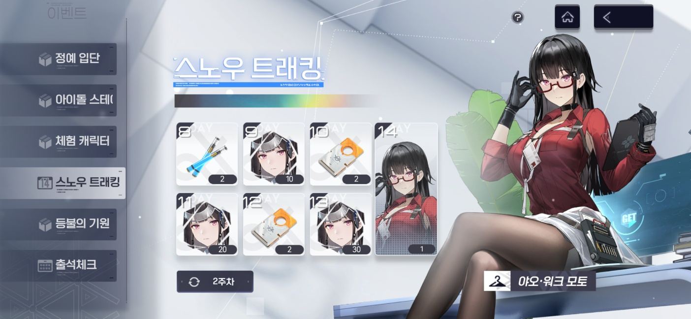 그 외에도 14일 출석에 따른 보상이 주어지는 스노우 트래킹 이벤트가 진행 중에 있습니다. 출석만 해도 퍼플 등급 캐릭터 아오와 코스튬 아오 워크모토를 비롯해 각종 아이템을 수령이 가능해 초반 부족함 없는 플레이를 즐길 수 있는 만큼 제대로 된 서브컬쳐 SF 게임의 매력과 슈팅RPG의 조합으로 기대 이상의 재미를 즐겨보고 싶다면 지금 스노우 브레이크: 포비든 존에 접속해 보시기 바랍니다.