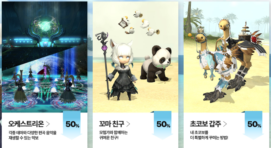 캐릭터 장비가 아닌 다양한 아이템도 준비되어 있는데요, 디지털 콜렉터를 포함해 염료, 하우징, 오케스티리온, 꼬마친구, 초코보 갑주등도 최대 50% 할인을 받아 구입할 수 있어 놓치면 두고두고 아쉬울 듯합니다.