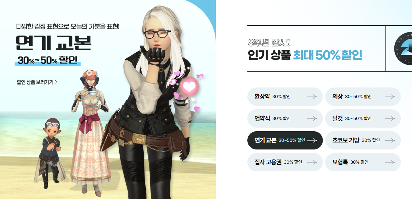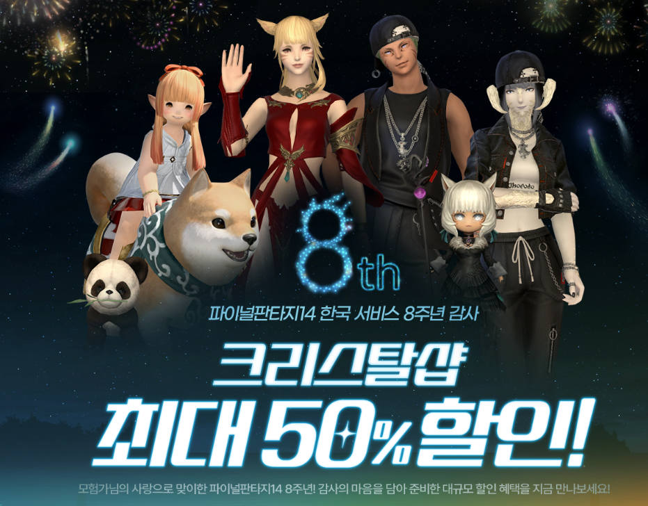 신생제 시즌과 함께 오는 8월 31일까지 파이널판타지 14 한국 서비스 8주년 감사 크리스턀샵 최대 50% 할인 이벤트가 진행됩니다. 평소 크리스탈샵에서 구입을 고민하던 아이템이 있다면 할인받고 구입할 수 있는 최적의 시기가 아닐까 싶습니다.