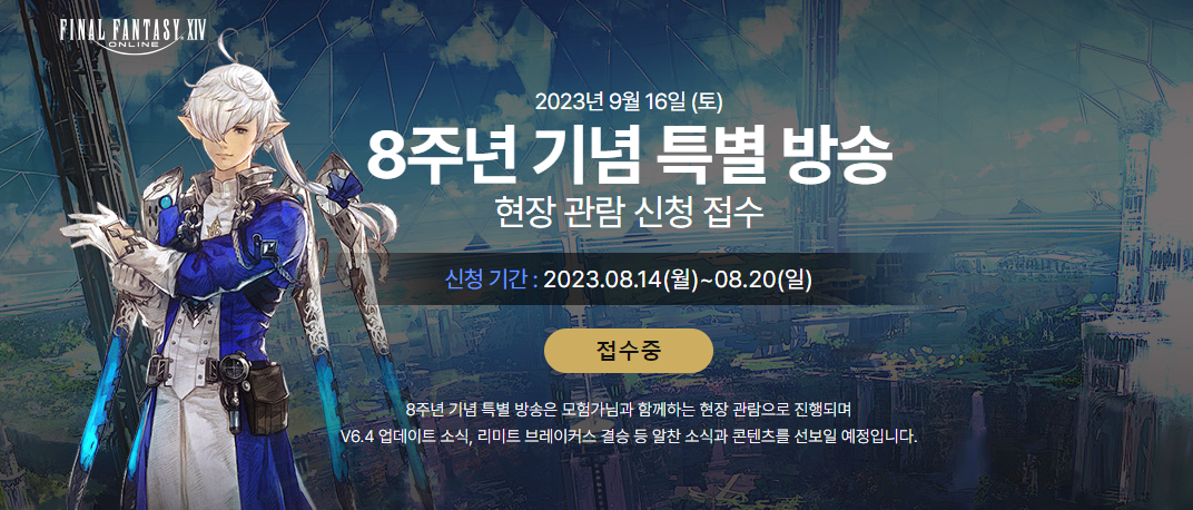 마지막으로 오는 9월 16일 할만한온라인게임 파이널판타지14 8주년 기념 특별방송 현장 관람 신청을 위한 접수가 오는 8월 20일까지 진행됩니다. 8주년 특별 방송은 모험가와 함께 하는 현장 관람으로 진행되는데요, V6.4 업데이트 소식과 리미트 브레이커스 결승등의 소식이 준비되어 있다고 하니, 관심 있는 분들은 서둘러 접수해 특별방송을 현장에서 직관하는 기회를 잡아보시기 바랍니다.
