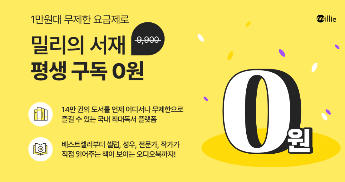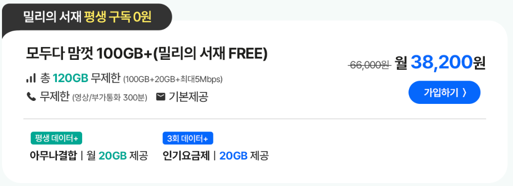 다양한 요금제 중에서도 책을 좋아하는 분들이라면 1만 원대 무제한 요금제로 밀리의 서재를 평생 0원으로 구독할 수 있는 요금제인 모두 다 맘껏 요금제를 눈여겨보시면 좋을 것 같습니다. 밀리의 서재 구독료만해도 9,900원인 부분을 생각하면 막 퍼주는 요금제가 아닐까 싶을 정도로 큰 혜택이니 말이죠.