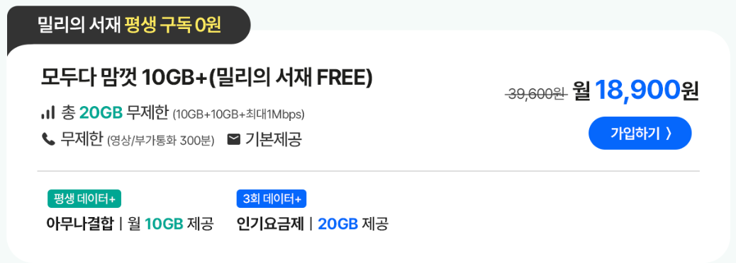 모두다 맘껏 밀리의 서재 구독료0원 요금제는 필요한 데이터에 따라 각기 다른 요금제를 선택할 수 있습니다. 그 중에서도 가장 눈에 띄는 건 아무나결합과 추가 데이터를 제공하는 요금제가 인기입니다. 모두다 맘껏 10GB+(밀리의서재 FREE) 요금제의 경우 월 18,900원의 비용으로 데이터 10GB+ 아무나결합 시 추가 10GB+ 최대 1Mbps/ 통화 무제한 / 문자 무제한)혜택이 주어지는데요, 20GB데이터를 월 1만원대에 사용가능한 요금제는 이보다 더 좋은건 없어 보입니다.