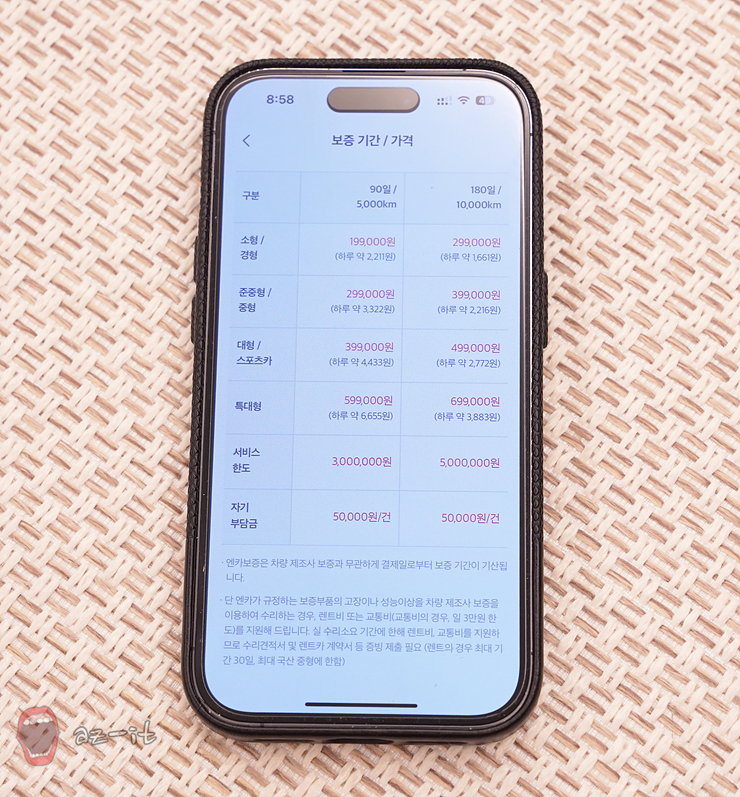 엔카보증은 차량과 기간에 따라 금액이 달라집니다. 전체금액을 놓고 보면 금액이 크다고 할 수 있지만, 180일 기준 소형은 하루 1,661원, 특대형은 약 3,883원으로 합리적이라는 생각이 들 정도인데요, 90일 5,000km와 180일 10,000mk 옵션 중 선택하여 가입할 수 있습니다.