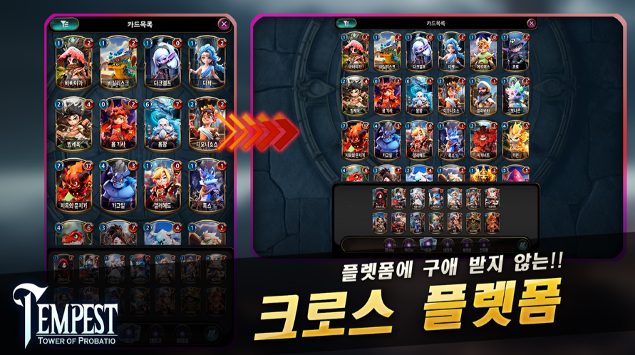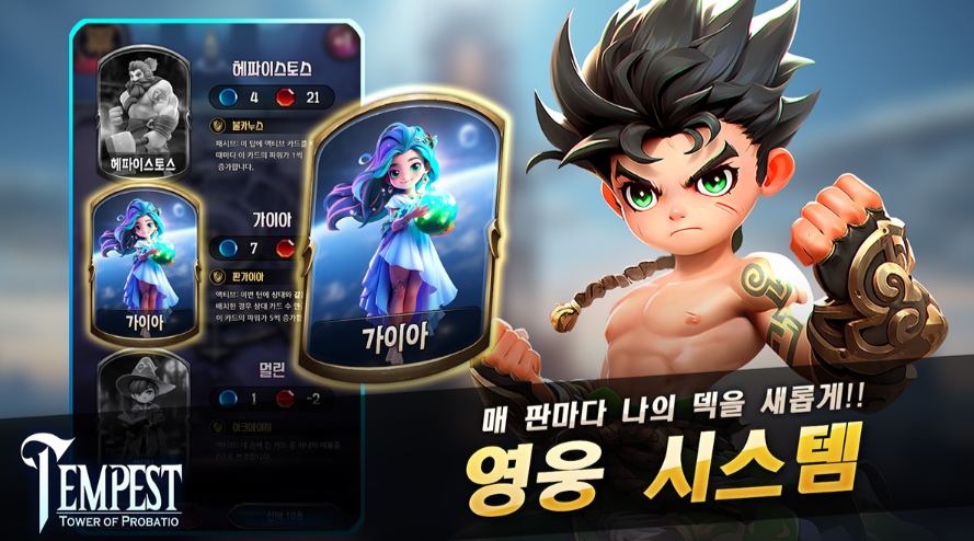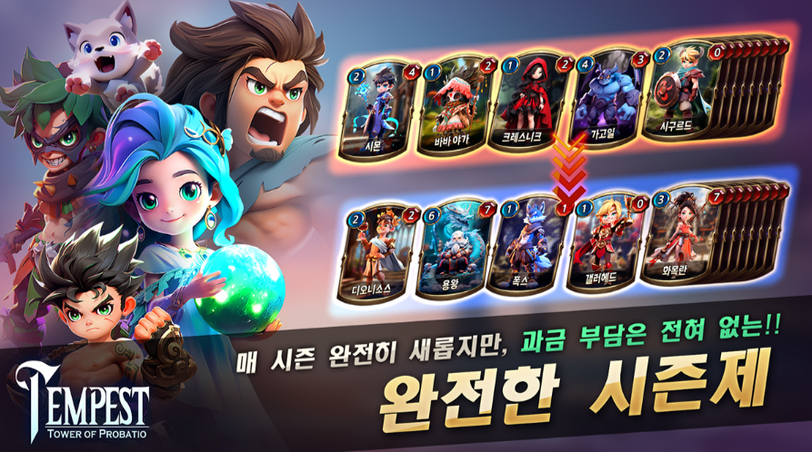 사전예약이 한창 진행 중인 템페스트는 신화, 동화 그리고 전설을 기반으로 한 300여장의 카드가 준비되어 있으며 여느 게임과 달리 매 시즌이 완전히 새롭게 시작되는 방식으로 진행됩니다. 매 시즌 뽑아야 할 카드에 대한 부담이 없어 언제든 과금을 통한 부담이 전혀 없는 점이 특징입니다.