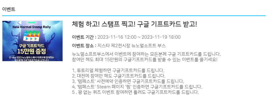 이 외에도 뉴노멀소프트 부스에서 진행되는 이벤트가 풍성하게 준비되어 있는데요, 꽝없는 퀴즈 이벤트부터 튜토리얼 체험에 따른 구글기프트카드까지 참여만 해도 최대 15만 원의 구글 기프트카드를 받을 수 있는 기회인 만큼 지스타 방문이 예정되어 있는 분들은 꼭 모든 혜택을 챙겨보시길 추천드립니다.