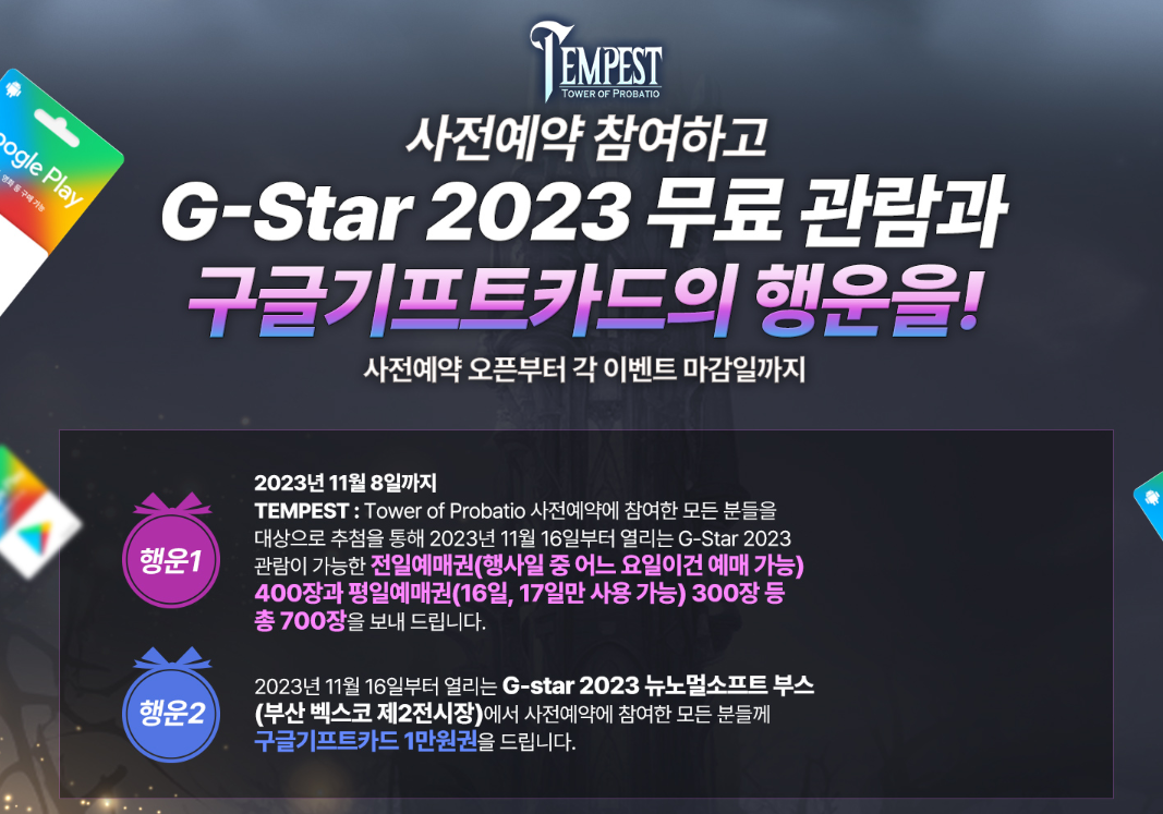 G-STAR2023 에서 만날 수 있는 뉴노멀소프트 템페스트 부스를 방문하기에 앞서 사전예약은 필수입니다. 전일 예매권과 평일 예매권 이벤트는 아쉽게 종료되었지만, 사전예약 참여 후 부스를 방문하는 것만으로도 구글기프트카드 1만 원권을 무조건 수령할 수 있기 때문입니다.