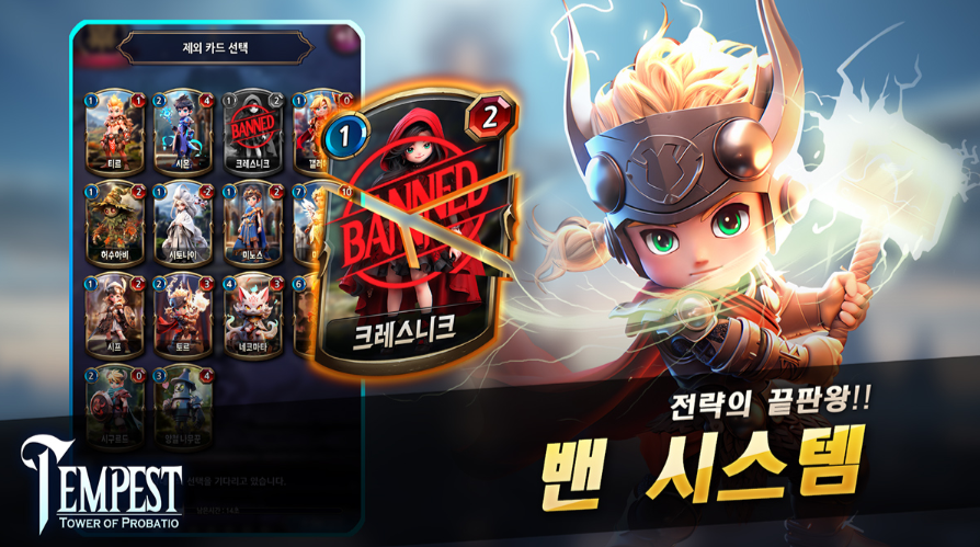 전략의 끝판왕이라고 할 수 있는 밴 시스템도 추가되었습니다. 템페스트의 밴 시스템은 상대의 카드 중 하나를 사용하지 못하게 만들어 상대 덱의 카운터 여부와 상관없이 모든 덱과 맞붙을 수 있는 전략을 부여하는 만큼 상대의 허를 찌르는 전략과 플레이를 즐길 수 있는 점도 특징입니다.