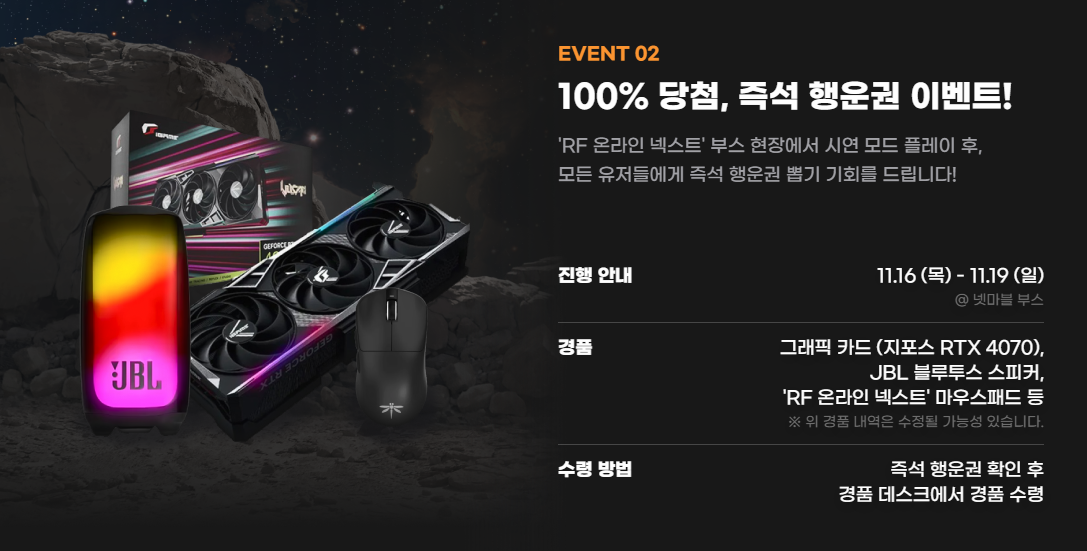 지스타 2023 넷마블 부스에서 시연 가능한 게임 플레이를 즐기고 참여가능한 이벤트도 준비되어 있습니다. RF 온라인 넥스트 부스 현장에서 이벤트 모드를 플레이한 후 당일 10의 이내 순위를 기록한 인원에게는 RF온라인 넥스트 커스텀 PC를 비롯해 무선 게이밍 헤드셋등 선물을 수령할 수 있습니다. 또한 시연모드를 플레이한 모든 유저에게 즉석 행원권 뽑기 기회가 주어지는데요, 그래픽카드를 비롯해 JBL 블루투스 스피커등 선물이 준비되어 있어 꼭 참여해 보시길 추천드립니다.