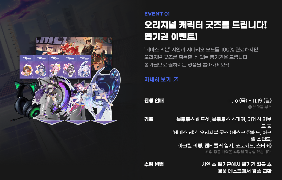 데미스 리본 부스 이벤트도 준비되어 있습니다. 데미스 리본 시연과 시나리오 모드를 100% 완료하면 오리지널 굿즈를 수령할 수 있는 뽑기권이 주어지는데요, 굿즈 외에도 블루투스 헤스셋이나 기계식 키보드등의 선물이 풍성하게 준비되어 있습니다. 특히 시연 시 추가 추첨권을 지급해 현장에서 추첨 이벤트도 진행하는 만큼 넷마블 신작 게임을 즐기고 풍성한 선물의 주인공이 되어보시기 바랍니다.