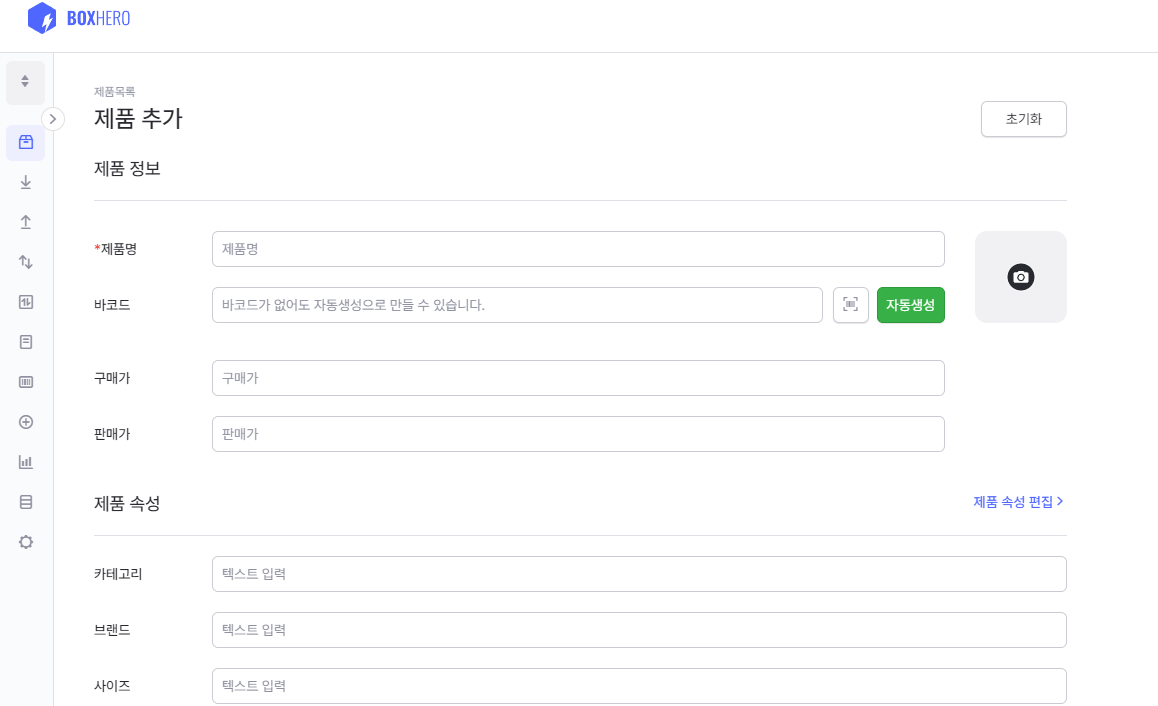 새로운 제품을 추가하는 방법도 간단합니다. 제품추가를 선택한 후 필수사항인 제품명 입력해도 등록이 가능합니다. 효율적인 관리를 위해선 제품명 외에도 구매가, 판매가등 제품에 대한 기본적인 정보를 기재하고 직관적으로 확인할 수 있는 사진을 올려주어야 하는데요, 판매를 위한 바코드의 경우 직접 작성하거나 생성해야 하지만, 자동생성 기능이 있어 편리하게 등록할 수 있습니다.
